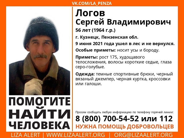 Накануне добровольцы пензенского отделения поискового отряда «Лиза Алерт» сообщили о пропаже 56-летнего жителя Кузнецка. 9 июня Сергей Логов ушел в лес и не вернулся.