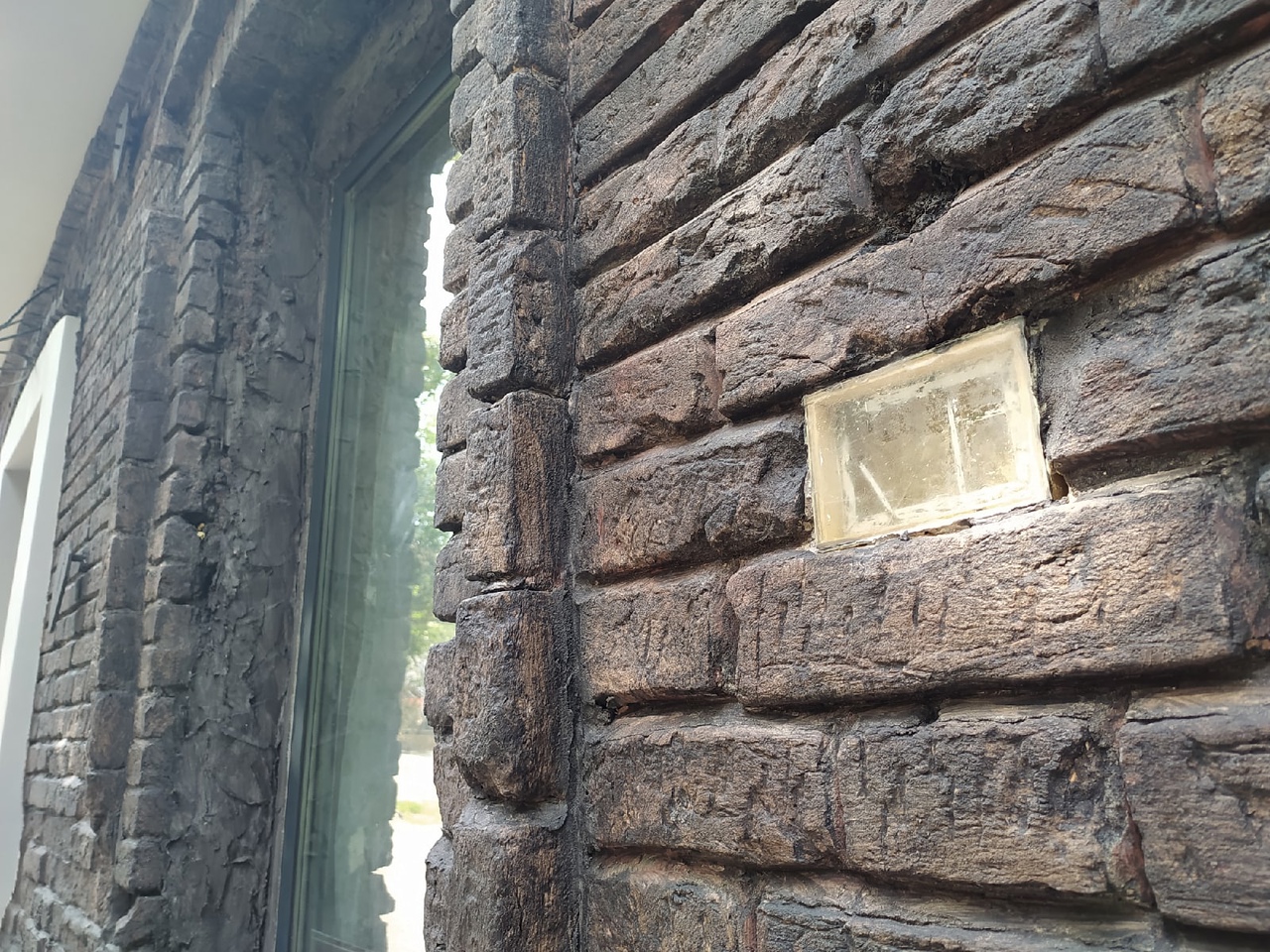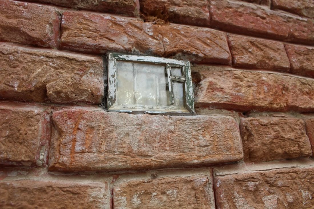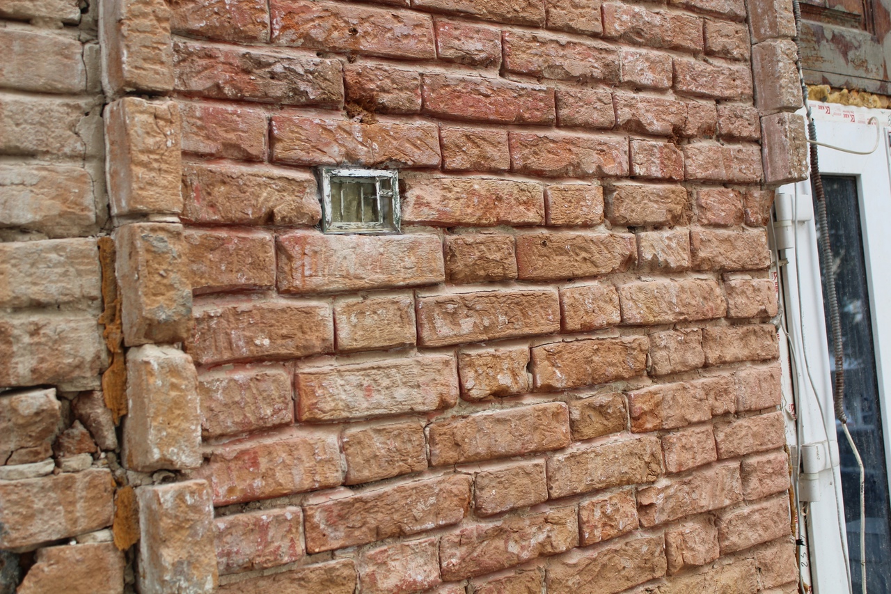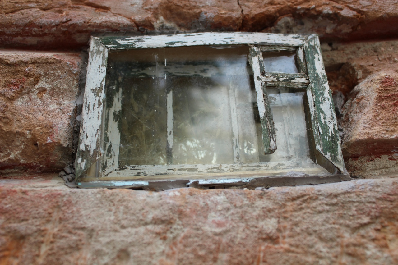Это окошечко зацепило внимание еще по осени. Видимо, рабочие наткнулись на него, когда отбивали старую штукатурку при отделочных работах на фасаде дома номер 32. Среди старой кладки дома расположилось оконце, размером в четверть кирпича, с какими-то цветами в глубине. Рамы, двойное остекление создавали полную иллюзию настоящего окна, только маленького.