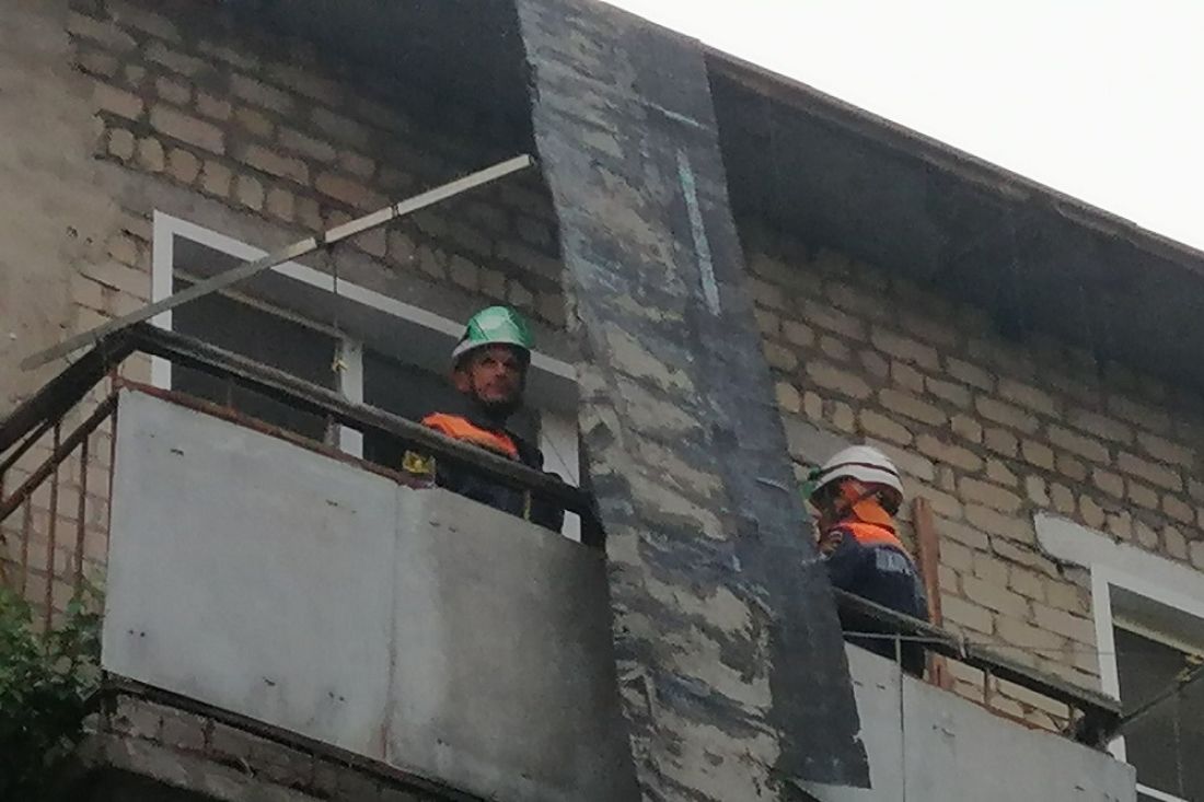На место прибыли спасатели, которые демонтировали оторвавшийся фрагмент кровли и складировали его на балконе заявителя.