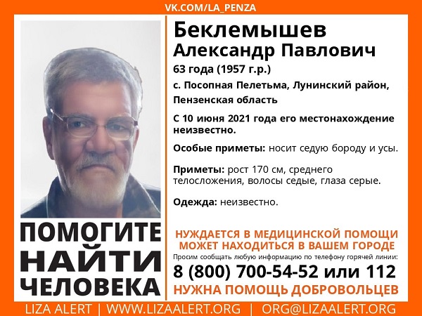 Пензенские волонтеры поискового отряда «Лиза Алерт» сообщили об исчезновении 63-летнего Александра Беклемышева. О его местонахождении нет информации с 10 июня.