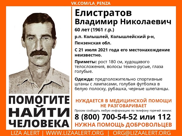 Пензенские добровольцы поискового отряда «Лиза Алерт» сообщили о безвестном исчезновении жителя рабочего поселка Колышлей. Где находится 60-летний Владимир Елистратов, неизвестно с 21 июля.