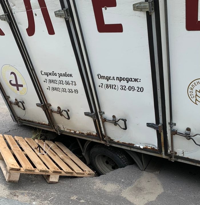 Сегодня около дома №21в по проспекту Строителей в Пензе случилось неожиданное дорожно-транспортное происшествие. Асфальт не выдержал веса грузового автомобиля и провалился под ним.