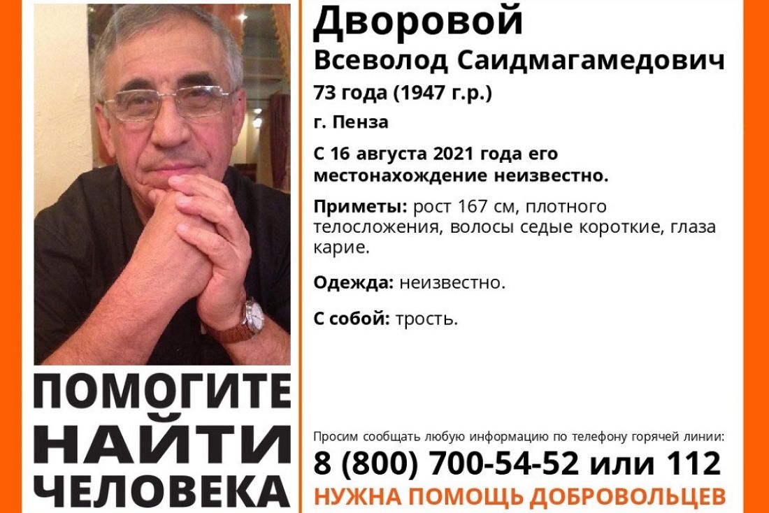Волонтеры сообщили, что 73-летний Всеволод Дворовой ушел из дома в неизвестном направлении 16 августа. На протяжении пяти дней у родственников нет информации о его местонахождении.