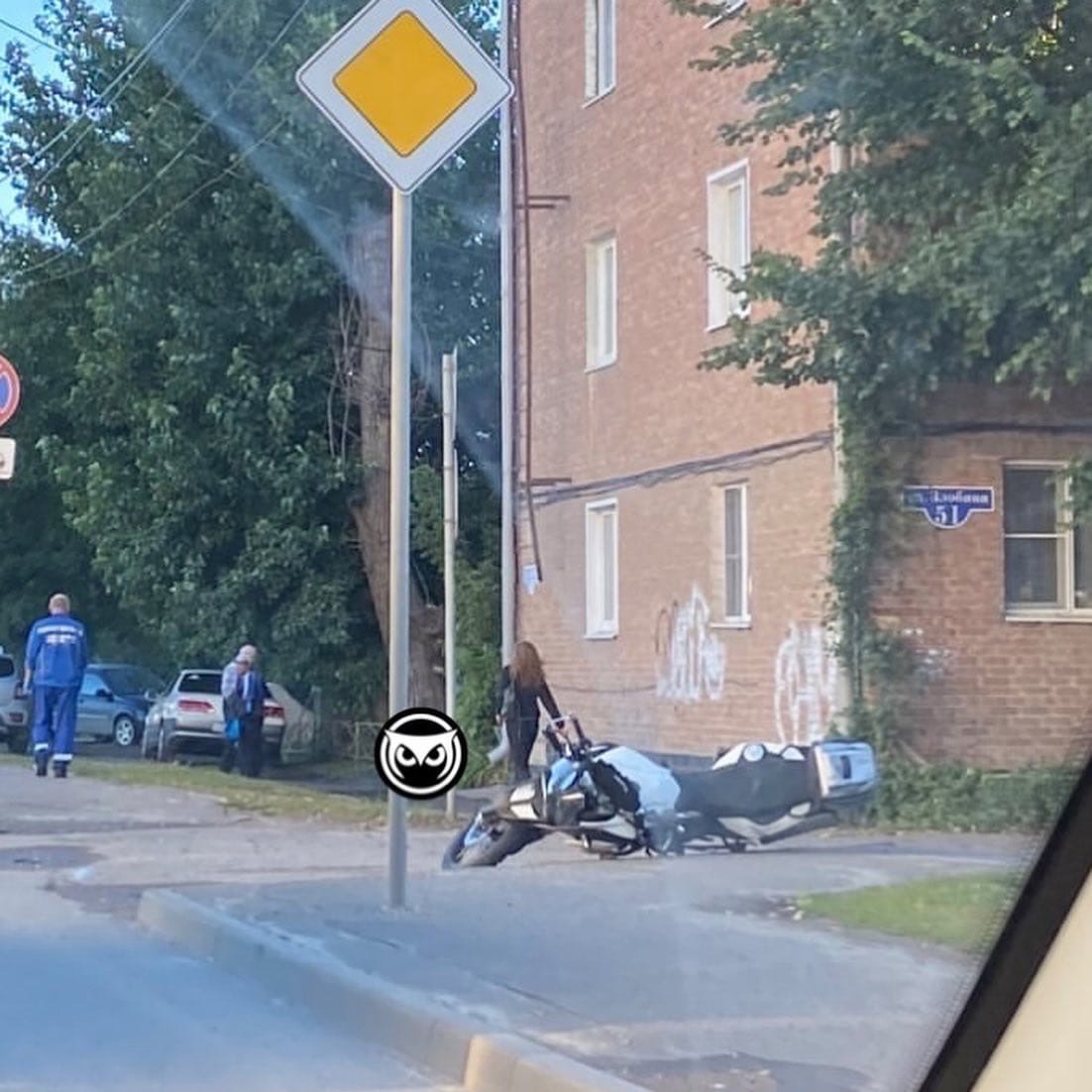 На кадрах виден повреждённый мотоцикл, а также тело погибшего, накрытое синим одеялом. Рядом с ним стоят работники скорой помощи.
