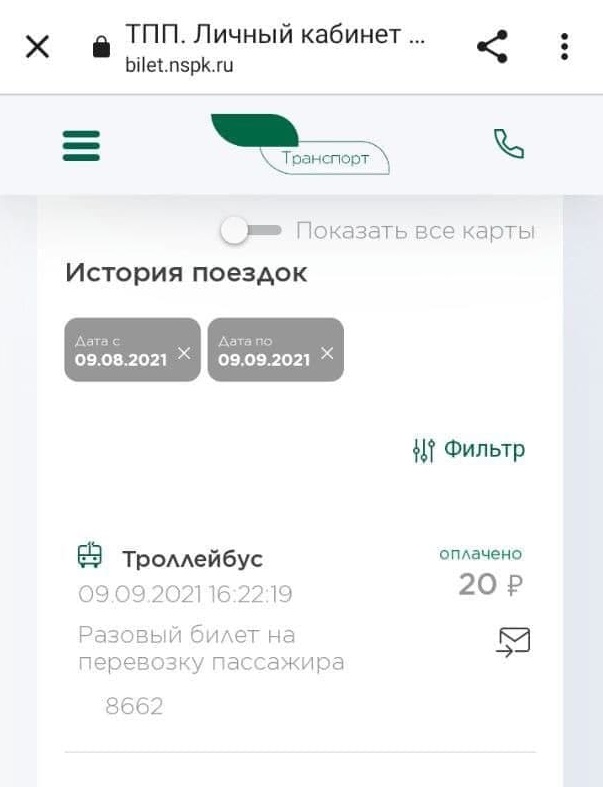 При желании, в конце дня или другие дни после совершения поездки, можно зайти на сайт https://bilet.nspk.ru/ , зарегистрироваться или перейти в ранее созданный личный кабинет и увидеть, что оплаченная поездка отображается в «Транспортной процессинговой платформе».