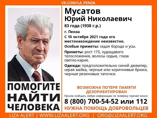 О местонахождении Юрия Мусатова неизвестно со вчерашнего дня, 10 октября. «Возможна потеря памяти. Дезориентирован», - сообщается в ориентировке, опубликованной в группе добровольцев в социальной сети «ВКонтакте».