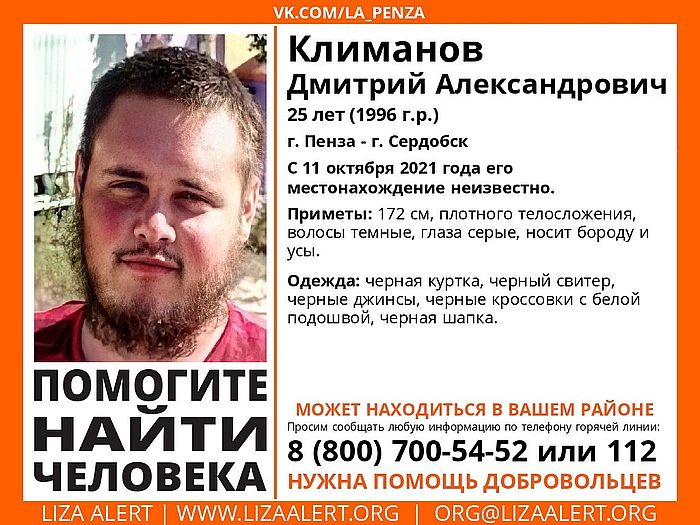 У родных и близких Дмитрия Климанова нет никакой информации о его местонахождении, начиная с 11 октября. Сообщение о пропаже 25-летнего мужчины появилось в группе «Лиза Алерт Пенза» в воскресенье вечером.