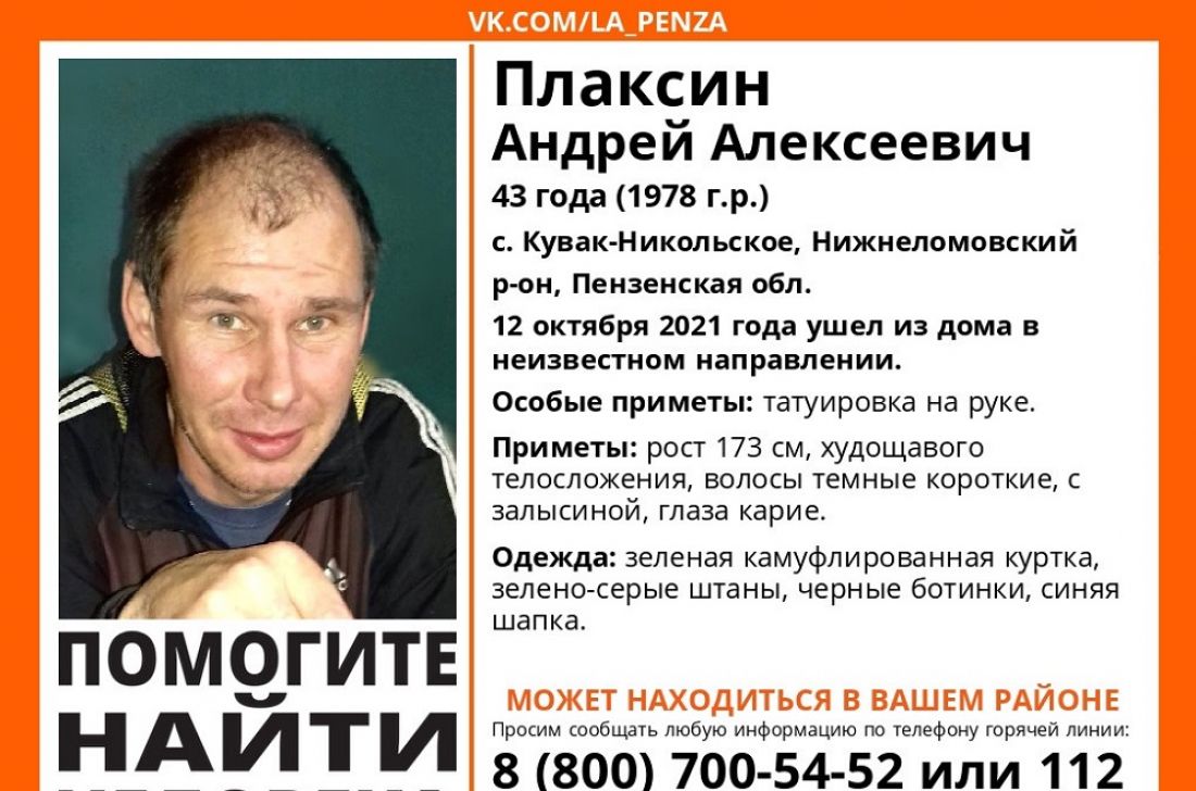 43-летний Андрей Плаксин 12 октября ушел из дома в неизвестном направлении. Информация о его исчезновении опубликована в группе поискового отряда Лиза Алерт Пензенской области.