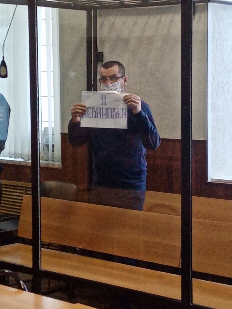 Подсудимый, не признавая своей вины, просил суд вынести в отношении него оправдательный приговор, в судебное заседание он явился с соответствующим плакатом.