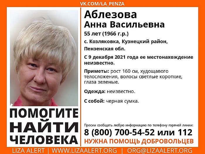 Во что была одета пропавшая, неизвестно. С собой у нее была черная сумка. Любую информацию об Анне Аблезовой можно сообщить по телефонам 8-800-700-54-52 или 112.
