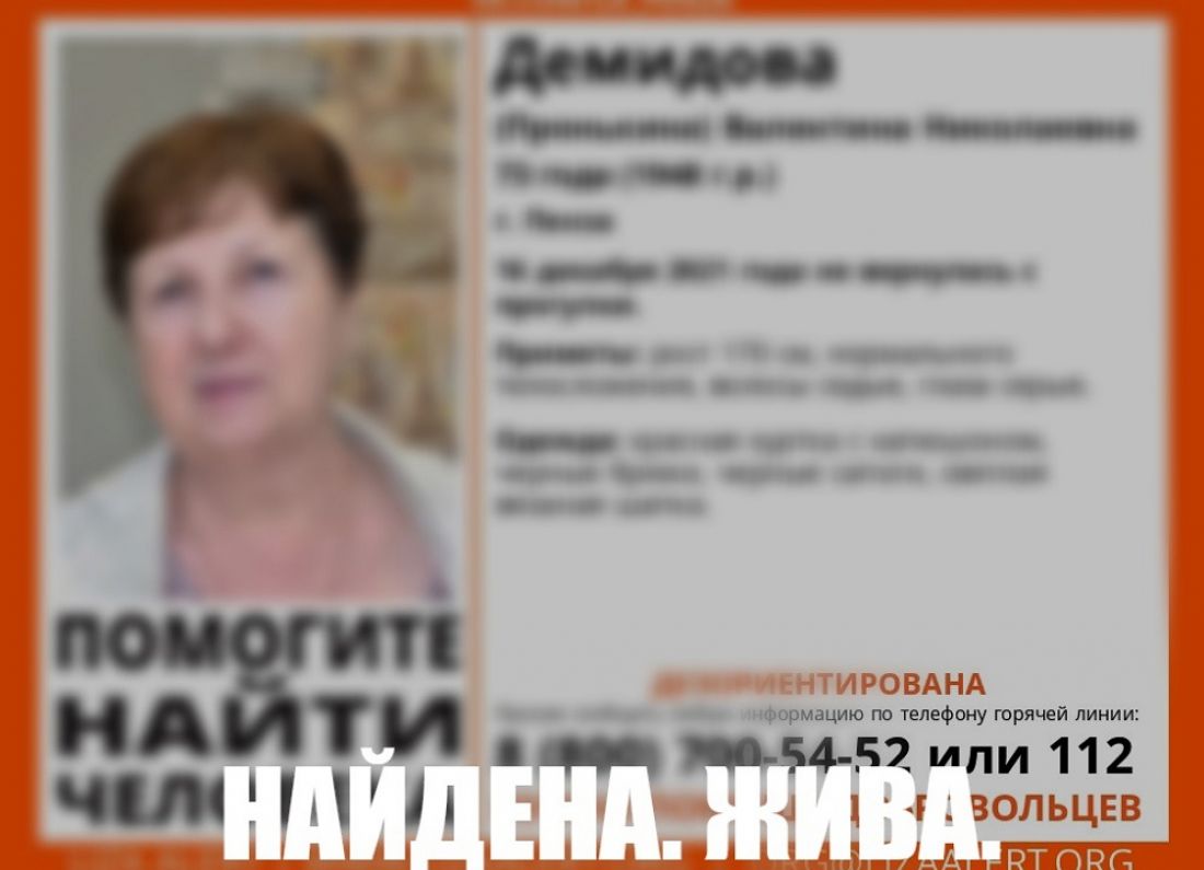 «Демидова Валентина Николаевна найдена, жива! Спасибо всем участникам поиска, а также неравнодушным внимательным подписчикам за ваши свидетельства!» - такой комментарий разместили представители поскового отряда «Лиза Алерт» под ориентировкой на пропавшую в группе в соцсети.