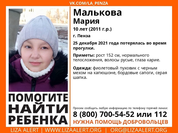 Пензенские волонтеры поискового отряда «Лиза Алерт» сообщили о пропаже ребенка. 10-летняя Мария Малькова потерялась в областном центре во время прогулки 25 декабря.