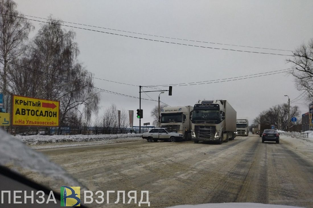 Снимки с места ДТП один из очевидцев прислал в редакцию портала «Пенза-Взгляд». Горожанин рассказал, что столкнулись фура и легковой автомобиль марки «ВАЗ-2199».