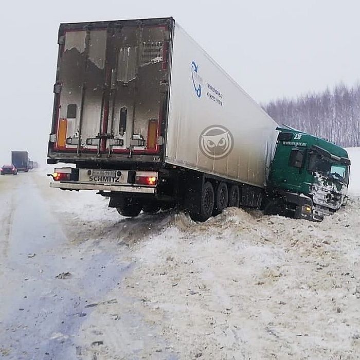 Информация об аварии появилась в группе «Сова Пенза авто» социальной сети «ВКонтакте». На опубликованном снимке видно, что машина увязла в сугробе, кабину фуры свернуло на сторону относительно прицепа.