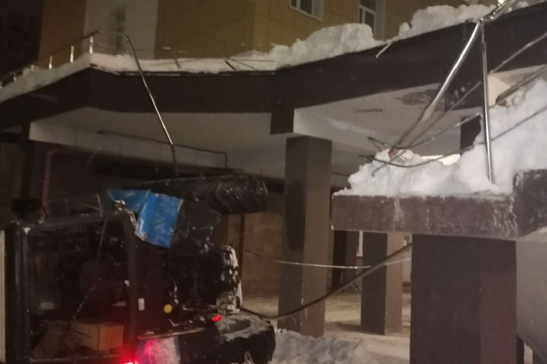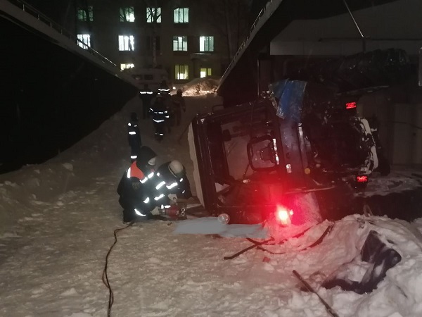 С пандуса здания перинатального центра областной больницы упал трактор. Транспортное средство чистило на эстакаде снег.