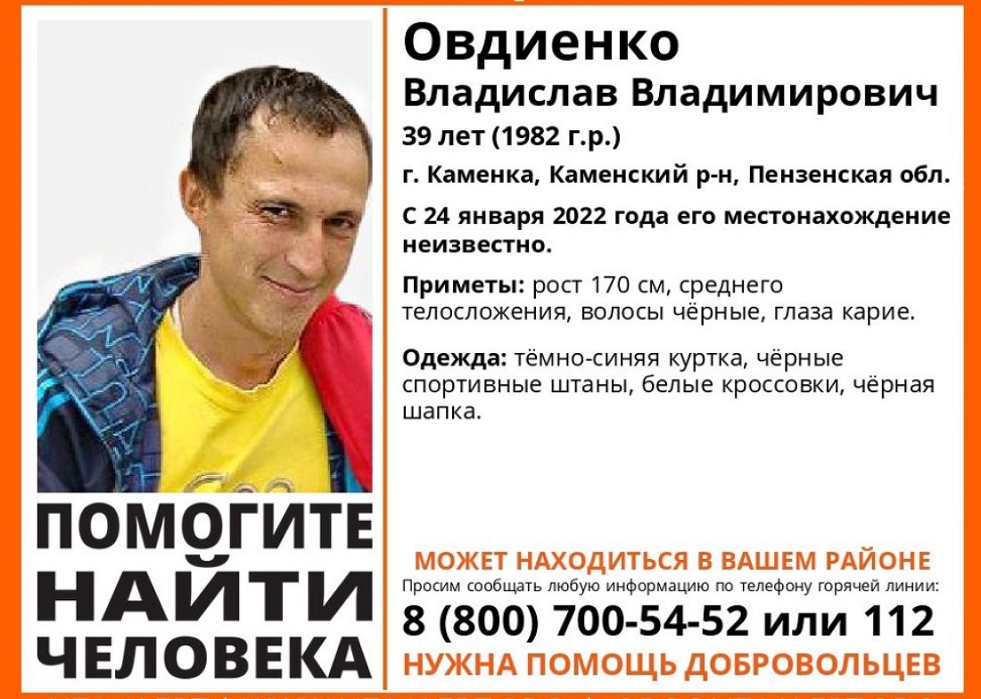 С 24 января этого года неизвестно местонахождения 39-летнего жителя Каменки Владислава Овдиенко.
