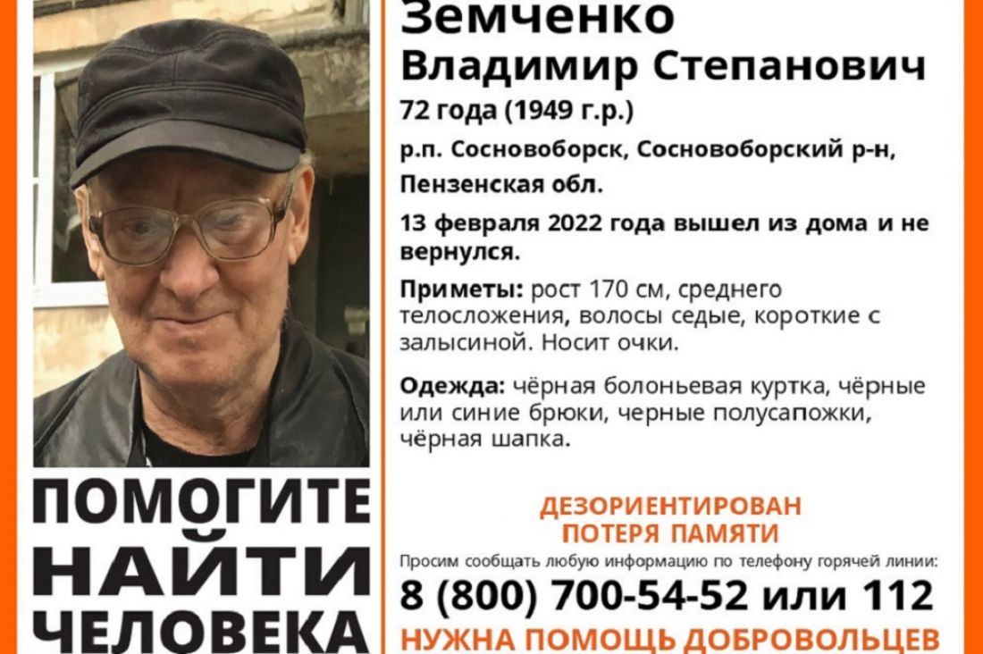 Как стало известно, Владимир Земченко ушел из дома накануне, 12 февраля, и до сих пор у родственников нет информации о его местонахождении.