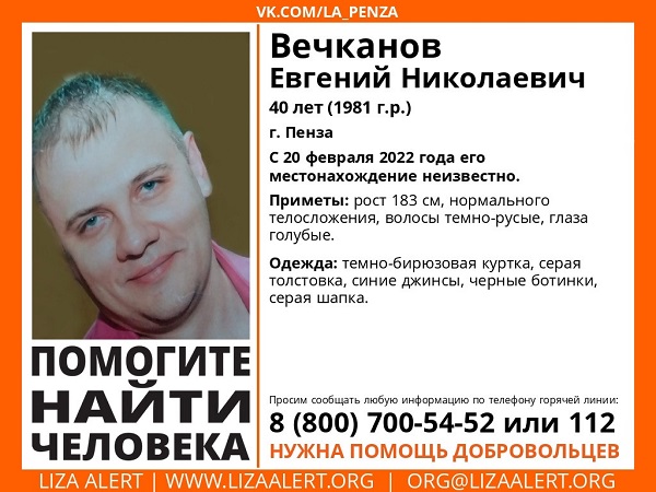 Волонтеры поискового отряда «Лиза Алерт» сообщили о безвестном исчезновении 40-летнего жителя Пензы. Местонахождение 40-летнего Евгения Вечканова неизвестно с 20 февраля.