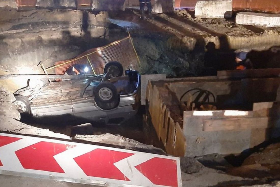 Сообщение об инциденте поступило в поисково-спасательную службу в 03:05. Прибывшие на место происшествия спасатели в защитных костюмах обследовали автомобиль и дно котлована. Пострадавших в результате случившегося не обнаружено. Судя по фотографии, которую предоставило ведомство, автомобиль упал с высоты и приземлился на крышу.