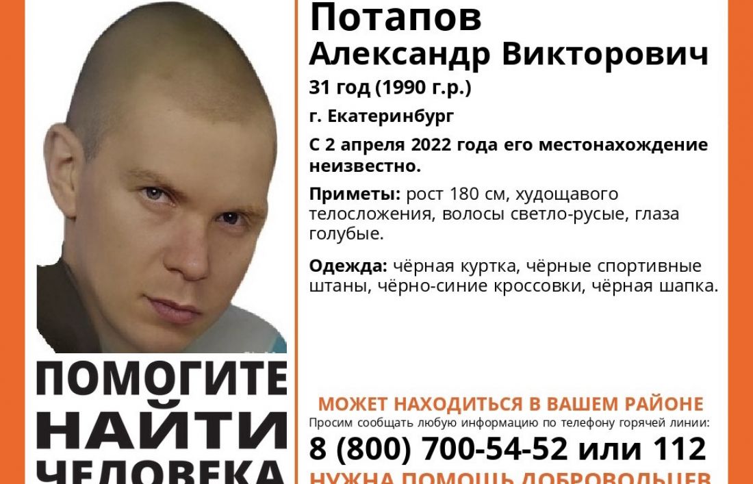 Александр Потапов ушел из дома 2 апреля. С того времени у родственников нет информации о его местонахождении. В группе «Лиза Алерт» в социальной сети «ВКонтакте» попросили жителей пензенского региона помочь в его поисках и в случае появления какой-либо информации о екатеринбуржце сообщить об этом в полицию или поисковикам.