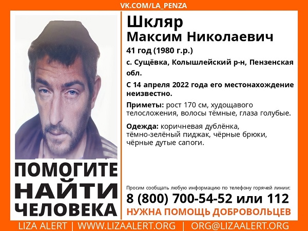 Волонтеры пензенского отделения поискового отряда «Лиза Алерт» сообщили о безвестном исчезновении жителя села Сущевка Колышлейского района. Сведений о местонахождении Максима Шкляра нет с 14 апреля текущего года.