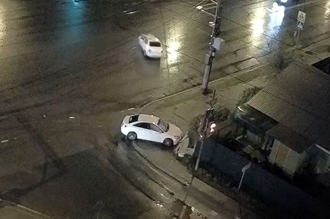 Затем остановившийся на перекрестке автомобиль, судя по всему, ограничил обзор на перекрестке еще двум участникам дорожного движения, которые смогли разъехаться, но не без последствий: одна машина вылетела с дороги на бордюр.