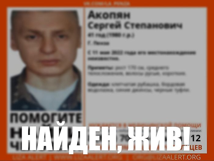 Утром 14 мая в группе поисковиков в социальной сети «ВКонтакте» появилось сообщение «Найден. Жив». Подробности обнаружения Сергея Акопяна и место, где он был найден, не раскрываются.