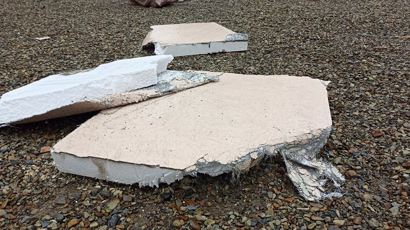 При ближайшем рассмотрении выяснилось, что это куски утеплителя, который должен защищать дом от осадков и ветра, продлевая тем самым срок службы строения. Однако сам утеплитель не выдержал непогоды.