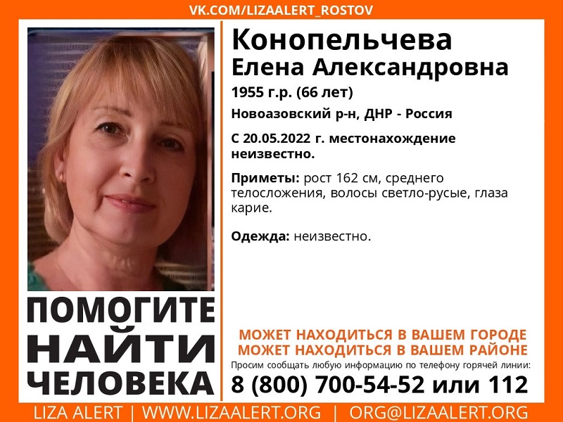 Также сообщается об исчезновении 66-летней Елены Конопельчевой, которая пропала 20 мая. Отмечается, что она также может находиться в любом городе, в любом районом центре.