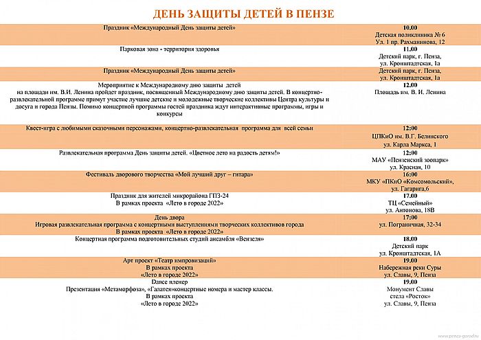 В пресс-службе мэрии заявили, что юных пензенцев и гостей города ожидают развлечения самого разного формата: спортивные соревнования, интеллектуальные викторины, развлекательные программы, квесты, dance пленер, театр под открытым небом, фестиваль дворового творчества, концерты и выставки рисунков.