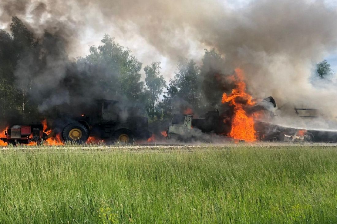 По данным ведомства, на 545-м километре дороги столкнулись фура, бензовоз и трактор. В результате автомобильной аварии разлилось горючее из резервуара бензовоза и загорелось.