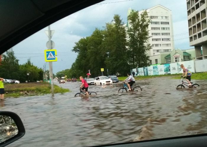После дождя здесь образовались такие лужи, что велосипедисты преодолевали их с погруженными наполовину в воду колесами.