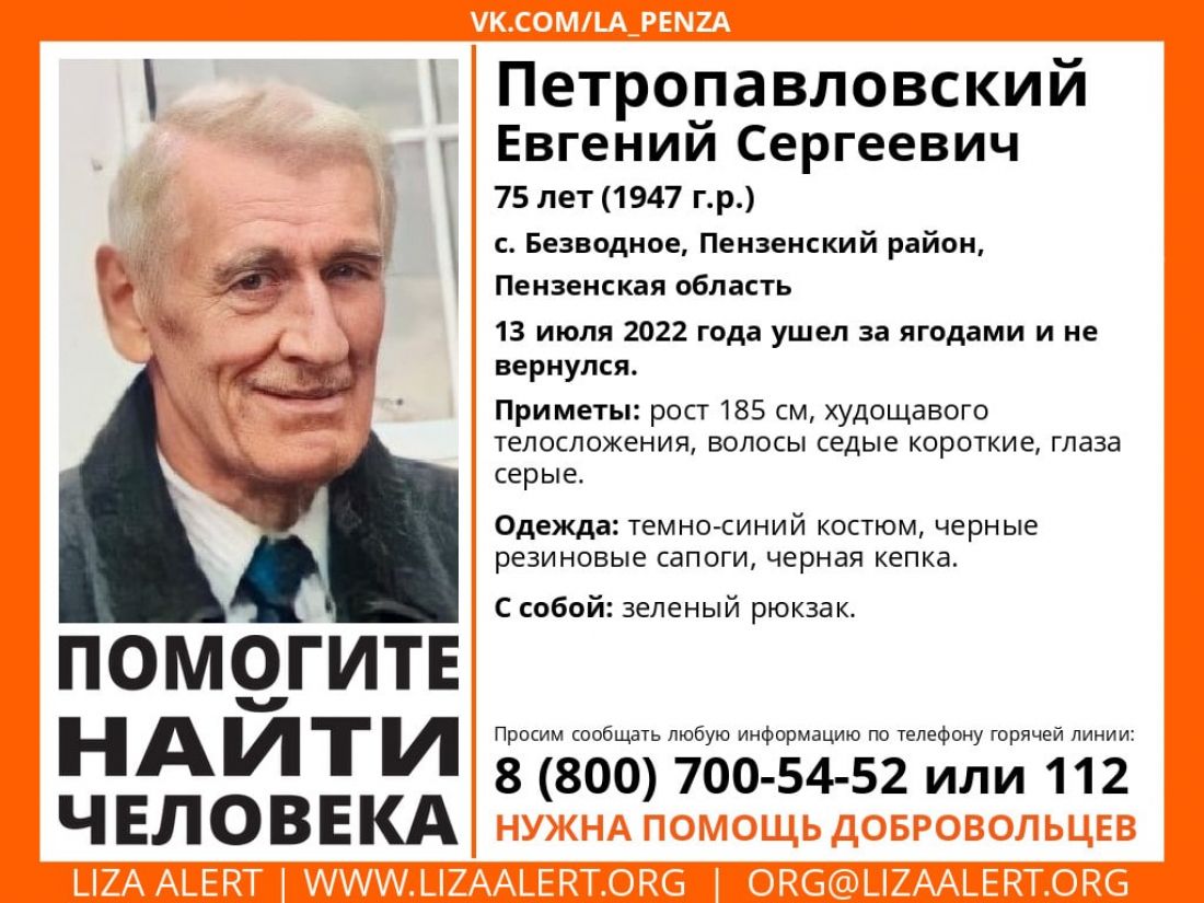 Евгений Петропавловский ушел за ягодами и не вернулся. Ориентировку на пропавшего разместили волонтеры поискового отряда «Лиза Алерт».