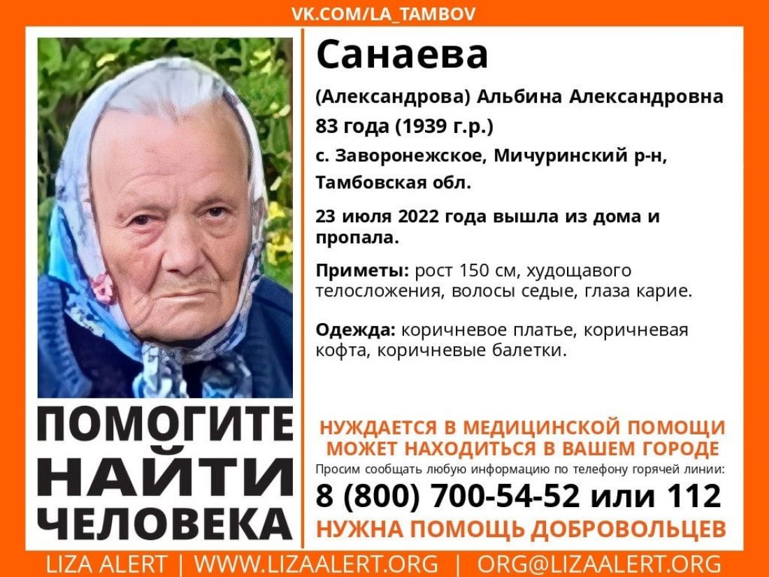 23 июля Альбина Санаева (Александрова) вышла из дома в с. Заворонежское Мичуринского района Тамбовской области и пропала.