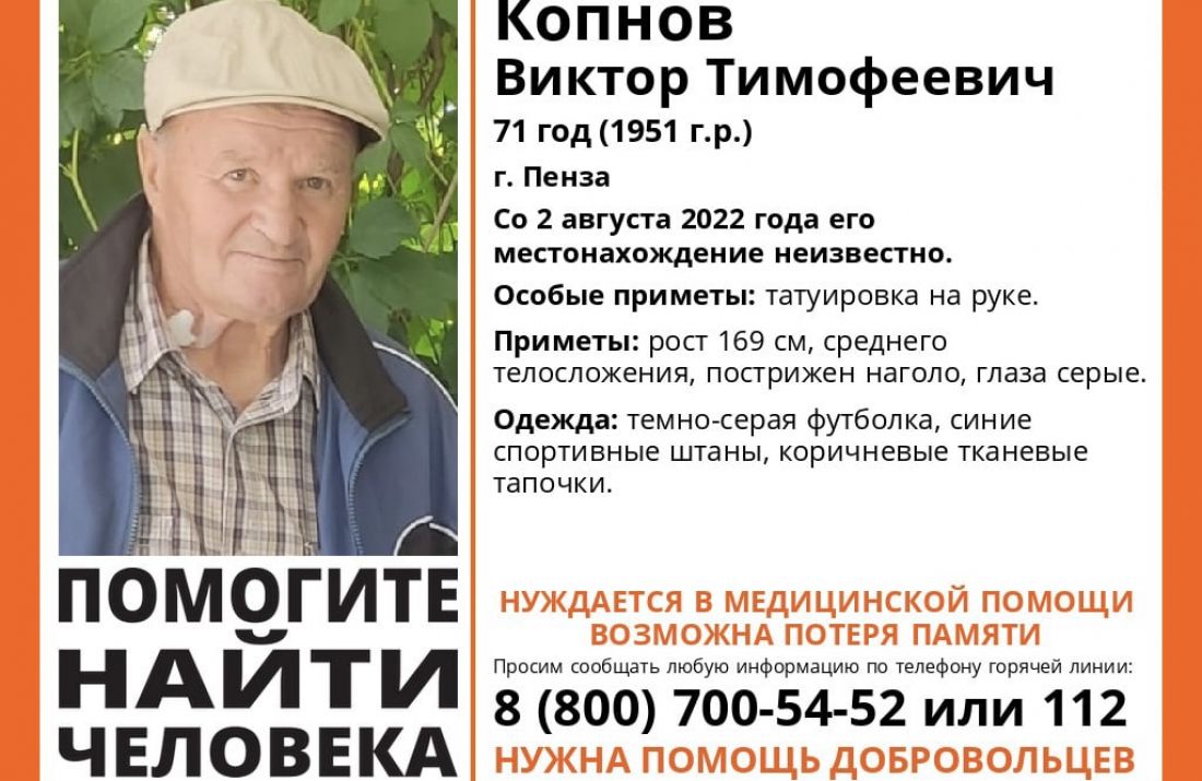 Виктор Копнов, проживающий в областном центре, ушел из дома накануне, 2 августа. До сих пор у родственников нет информации о его местонахождении.