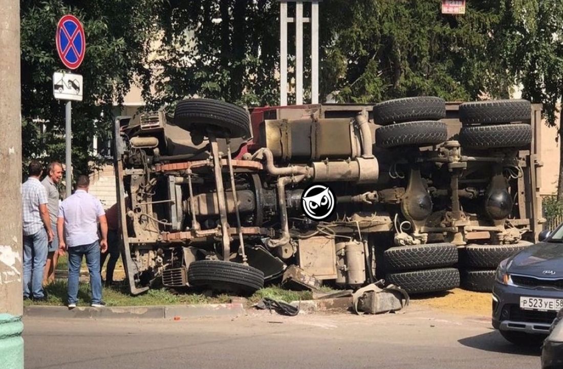 О происшествии сообщили очевидцы в социальной сети «Вконтакте». Фотографии с места инцидента появились в группе «Сова Авто г. Пенза». На фотографии, присланной в сообщество очевидцами ДТП, видно, что грузовик завалился набок, частично оказавшись на тротуаре.