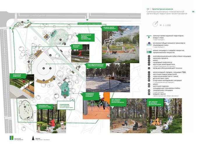 Зареченский проект «Парк Заречье. Открой для себя» подразумевает создание природного амфитеатра среди сосен, восстановление детского велосипедного городка и площадки для изучения ребятами правил дорожного движения.