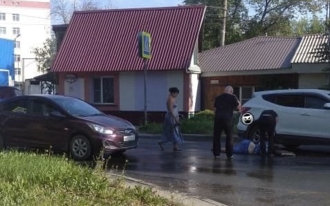 На фото видно, что пострадавшая лежит на асфальте. Рядом столпились несколько человек, желающих помочь. Автомобиль скорой помощи, вероятно, на момент съемки еще был в пути к месту аварии. Обстоятельства инцидента и информация о состоянии пешехода уточняются.
