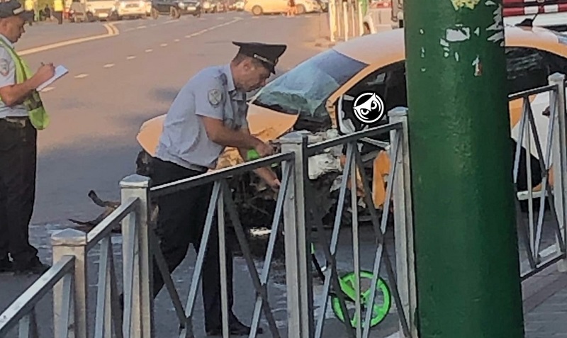 На снятых кадрах видно, что автомобиль такси, столкнувшийся с пассажирским автобусом, получил серьезные повреждения - у машины отлетело колесо, бампер. Подробности читайте здесь.