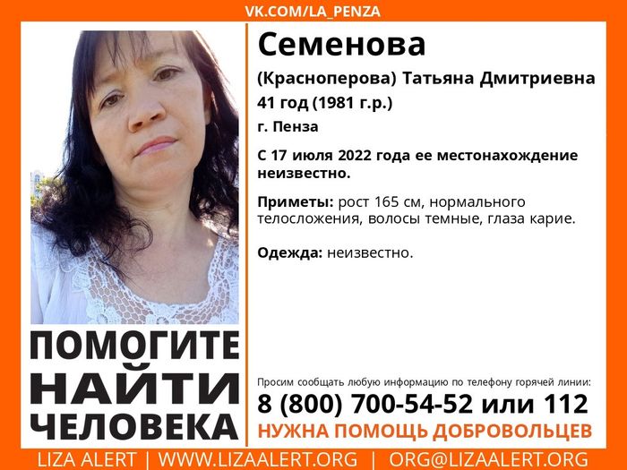С 17 июля текущего года родным и близким Татьяны Семеновой (Красноперовой) ничего не известно о ее местонахождении. Ориентировка на пропавшую появилась в группе «Лиза Алерт Пенза» соцсети «ВКонтакте».