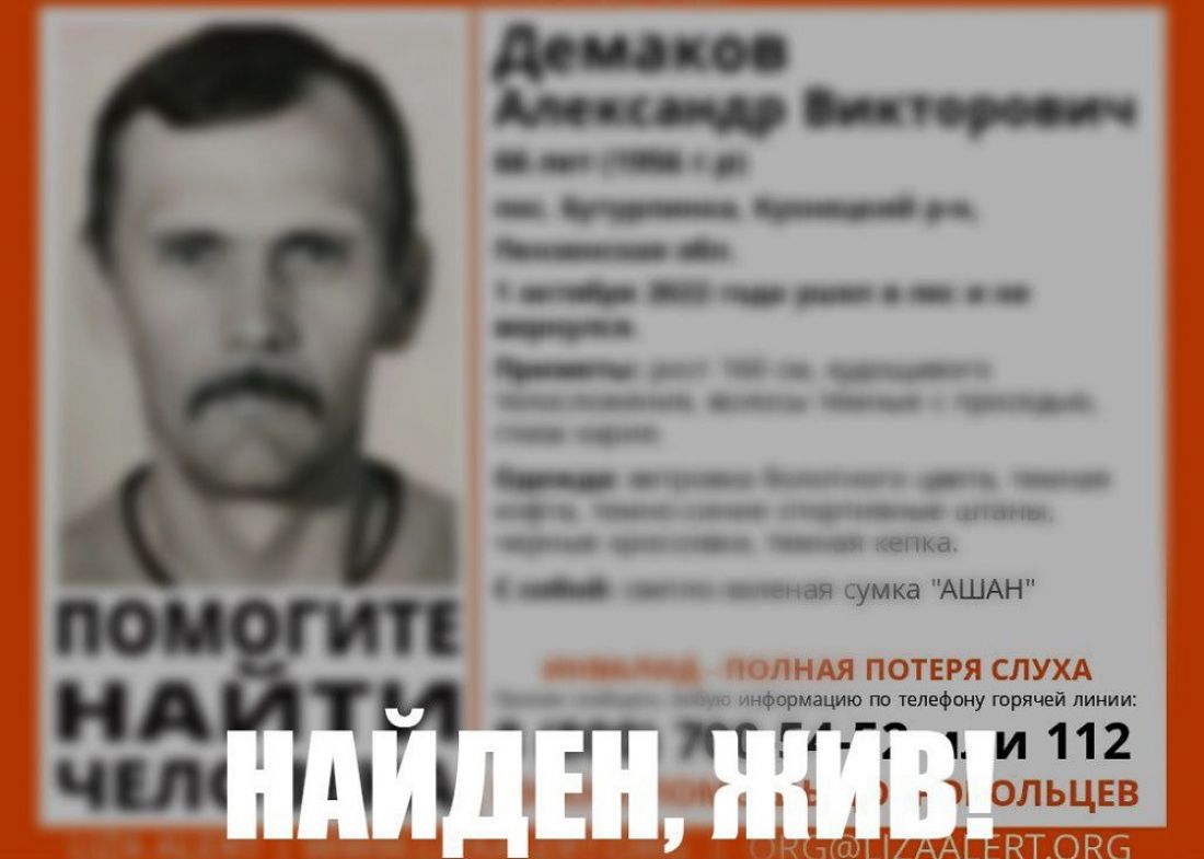 Напомним, 1 октября 66-летний житель поселка Бутурлинка Кузнецкого района Александр Демаков ушел в лес и не вернулся. Его поисками занимались близкие, полиция и добровольцы. Согласно ориентировке, что у мужчины инвалидность - полностью утрачен слух. Где и при каких обстоятельствах был найден пропавший, не сообщается.
