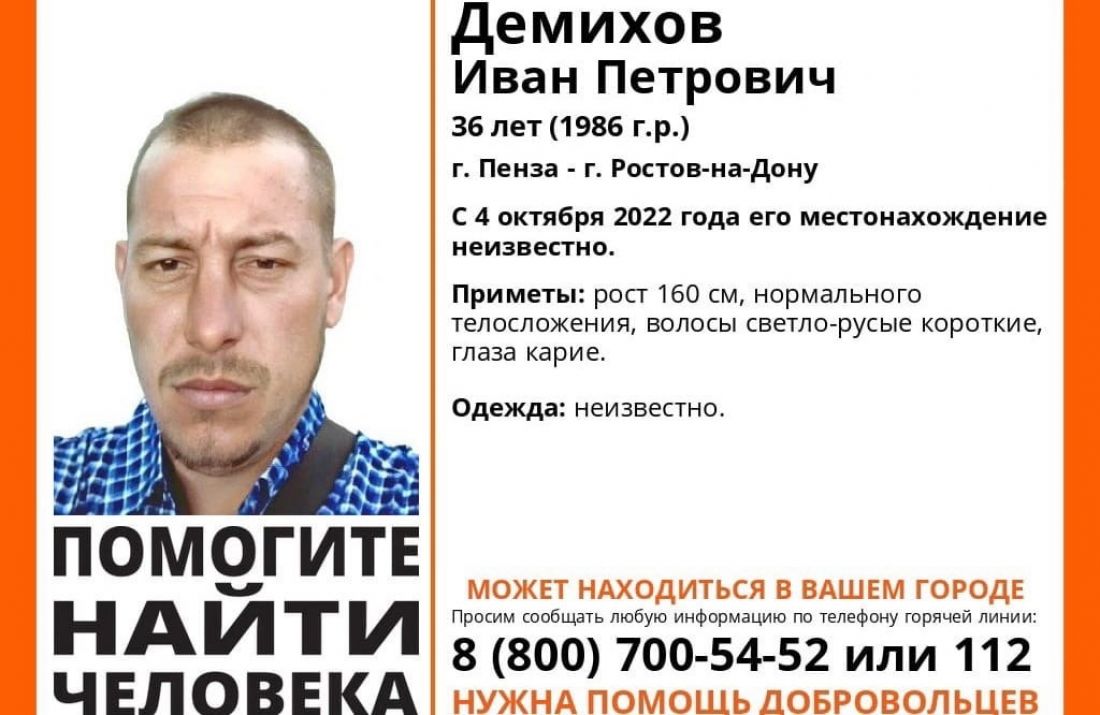 Как стало известно, мужчина пропал на этой неделе – у родственников нет информации о его местонахождении с четвертого октября. По информации волонтеров, Иван Демихов может находиться в двух городах – Пензе и Ростове-на-Дону.