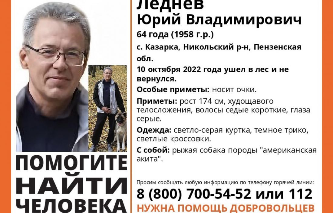 Там же опубликованы приметы пропавшего: рост 174 сантиметра, худощавого телосложения, седые волосы, серые глаза. Особо отмечается, что мужчина носит очки. Кроме того, известно, что в лес он ушел с собакой породы американская акита.