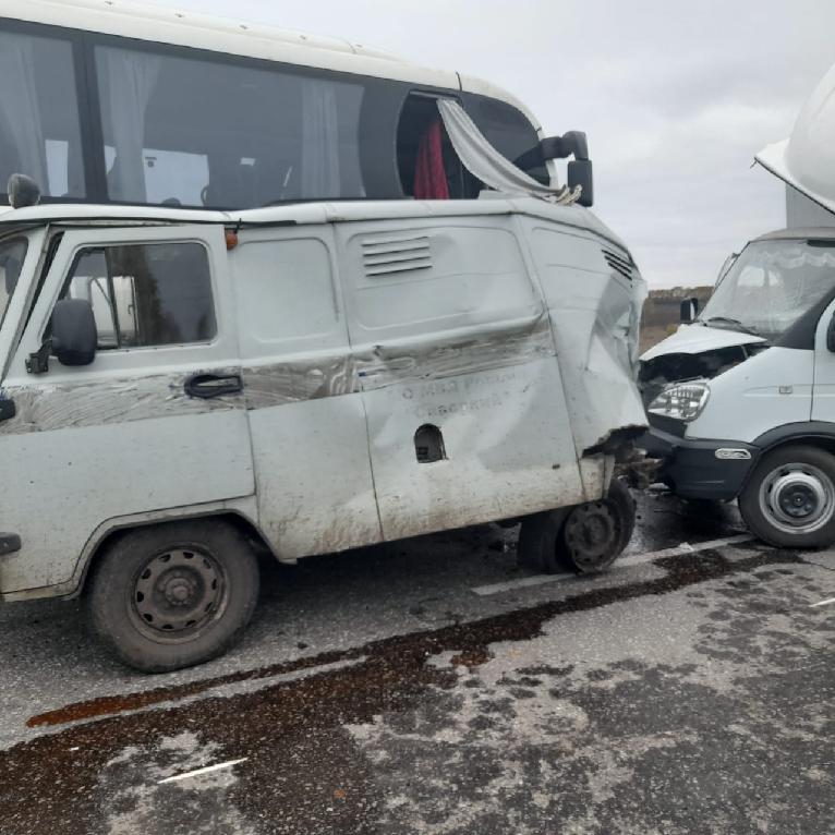 На опубликованных кадрах видно, что все три участника аварии получили значительные повреждения. Так, у рейсового автобуса вышибло лобовое стекло, также у него повреждена нижняя передняя часть. При этом «УАЗ» покорежило буквально со всех сторон, а у «Газели» помяты бампер и капот.