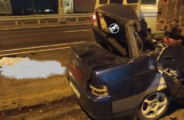 Неподалеку на асфальте видно накрытое тело человека. Предположительно, это водитель легковой машины, который погиб при столкновении.