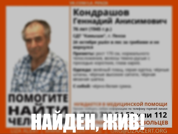 С 24 октября шли поиски 76-летнего Геннадия Кондрашова. Пенсионер ушел из СДТ «Камыши» города Пенза за грибами в лес и пропал. Позже в сообществе «Поисковый отряд ЛизаАлерт» появился пост о том, что мужчина найден и жив.