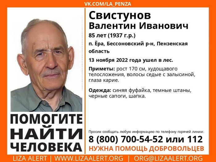 13 ноября ушел в лес и не вернулся 85-летний житель поселка Ера Бессоновского района Валентин Свистунов.