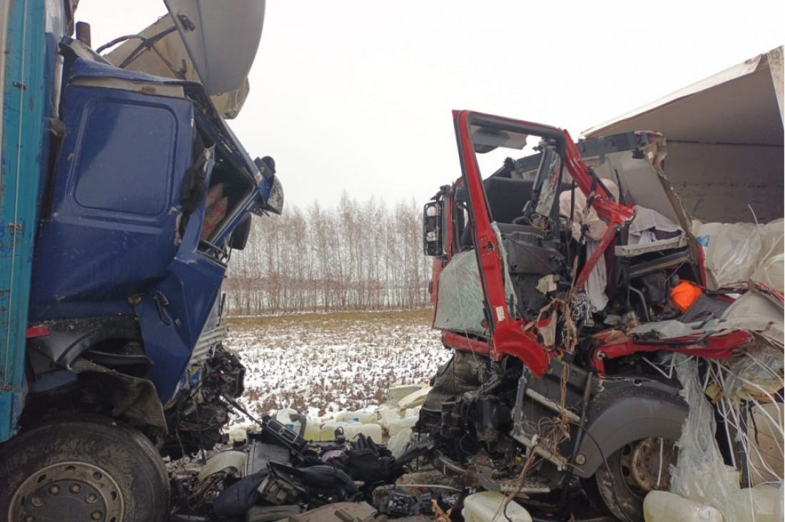 На снимках запечатлены попавшие в страшную аварию автомобили «МАЗ» с полуприцепом «Кёгель», которым управлял мужчина 1963 года рождения, и «MAN», за рулем которого находился мужчина 1979 года рождения. Кабины машин серьезно повреждены, часть груза оказалась на дороге.