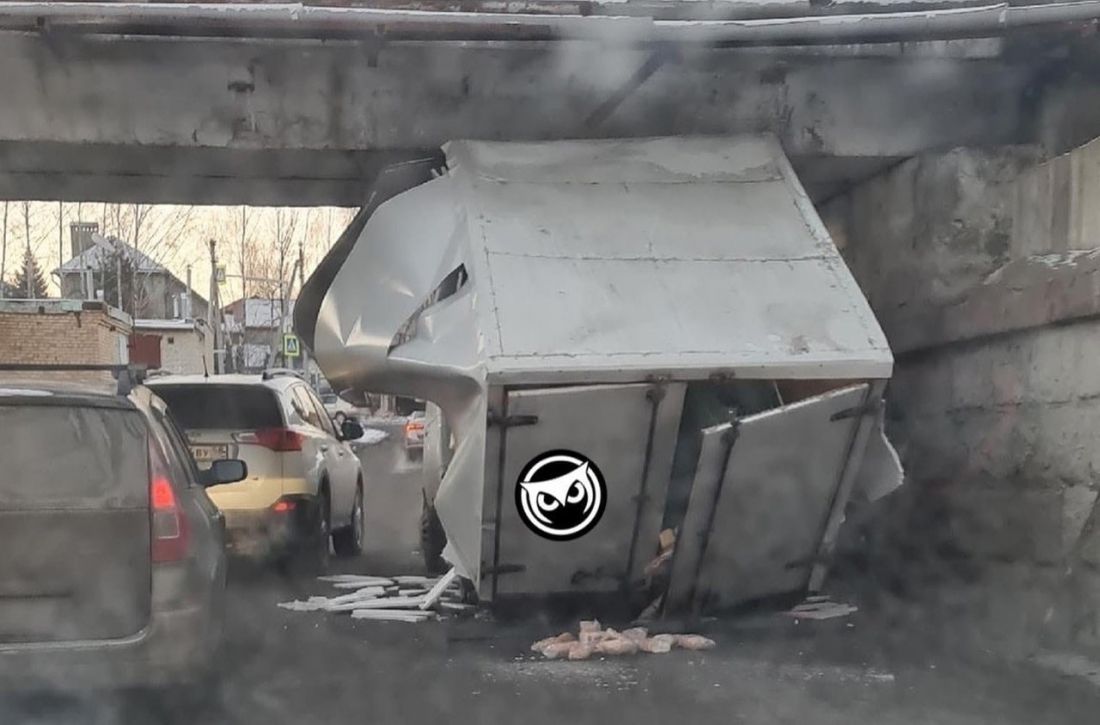 Судя по фотографии, грузовая «ГАЗель» пыталась проехать под путепроводом, но не прошла по габаритам. В связи с этим оказалась серьезно повреждена задняя часть машины. Видимо, водитель все-таки надеялся «протолкнуться» через невысокий проем.