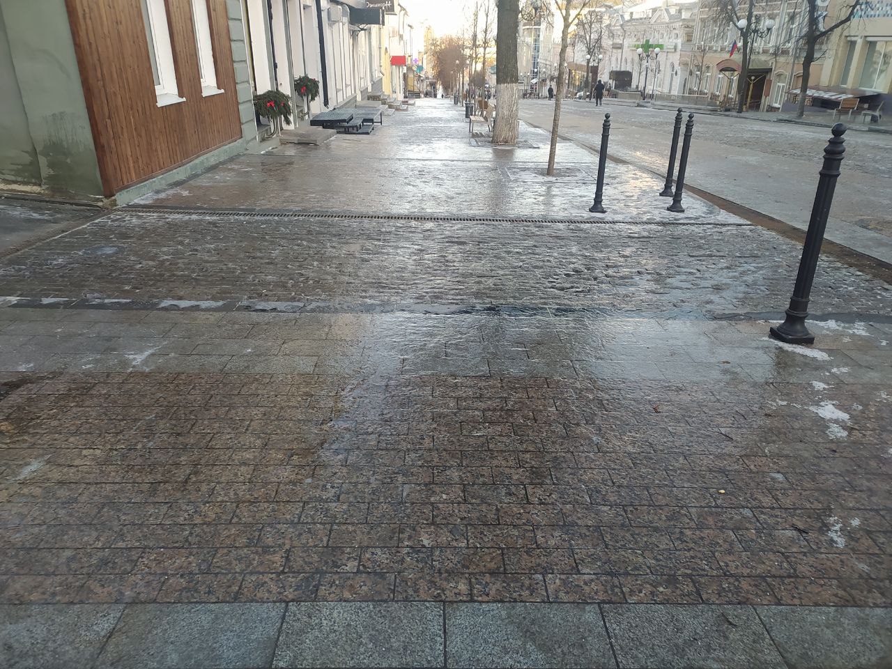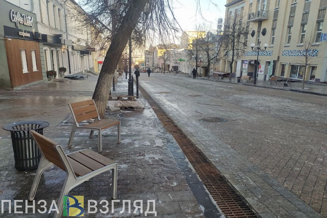 Из-за воскресной непогоды реконструированный участок главной пешеходной улицы Пензы превратился в ледяную горку.